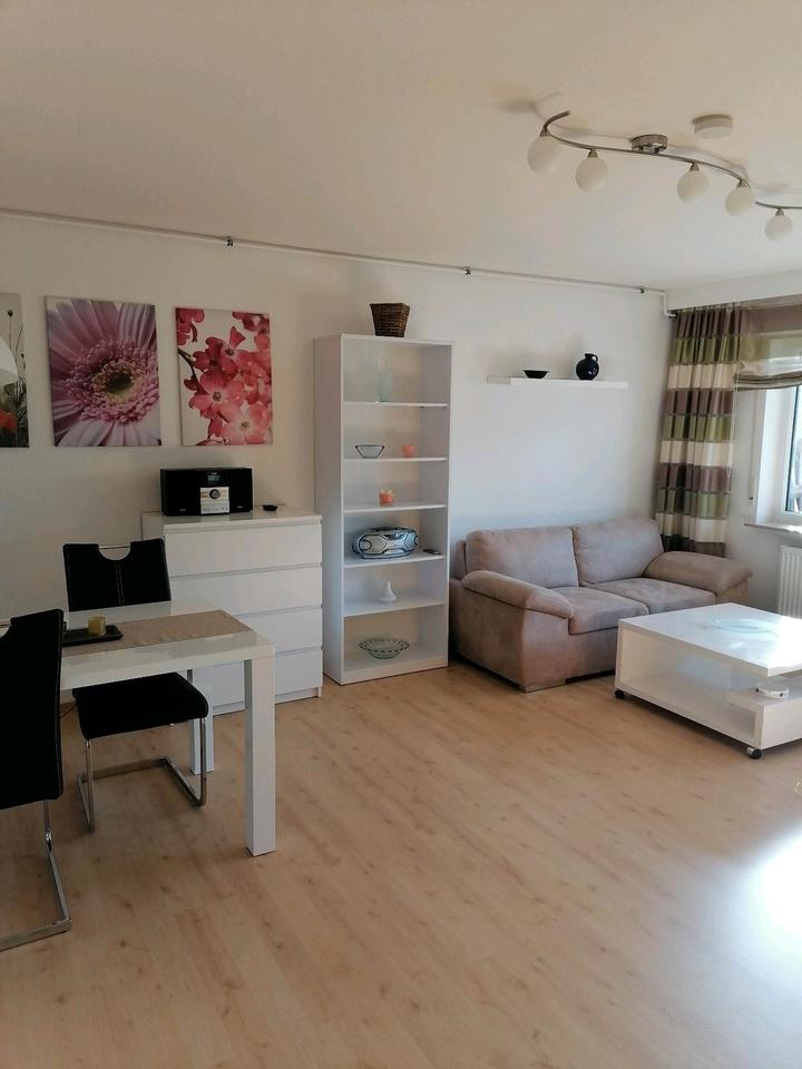 Vermiete eine Einliegerwohnung möbliert 45 Quadrat Meter mit Autostellplatz, Keller für Waschmaschine, Terrasse, separater Eingang, Einbauküche und Internet.