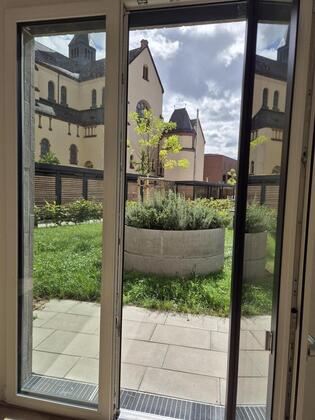 Schöne, lichtdurchflutete Einzimmerwohnung, hohe Decken (3,5 m), Terrasse und offener Gartenbereich, Bodenbelag: Vinyl in Holzoptik, bodentiefe Fenster, Heizung über Fernwärme (KFW55+EE),